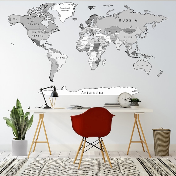 Grеy World Map Wall Decal Detailed Political Map Wall Sticker